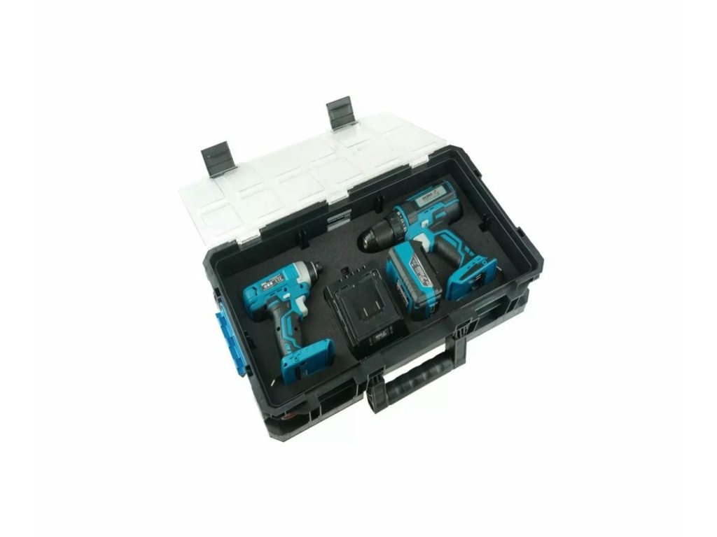 Táto sada je dodávaná ako kompletný balíček pripravený na prácu. V odolnom plastovom kufri nájdete okrem oboch strojov aj dve Li-Ion batérie a rýchlonabíjačku. Vďaka dvom batériám môžete pracovať bez prerušenia – kým s jednou pracujete, druhá sa nabíja. Kufor zaisťuje bezpečné skladovanie a jednoduchý transport celej sady. Je to inteligentné riešenie, ktoré vám šetrí čas aj peniaze.