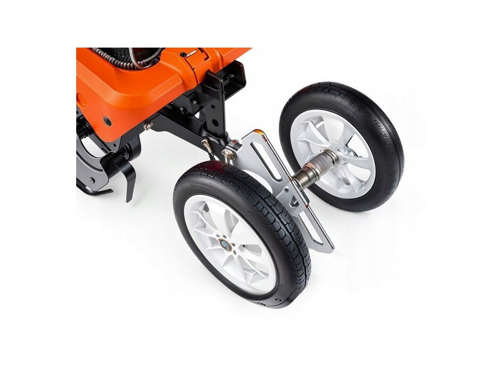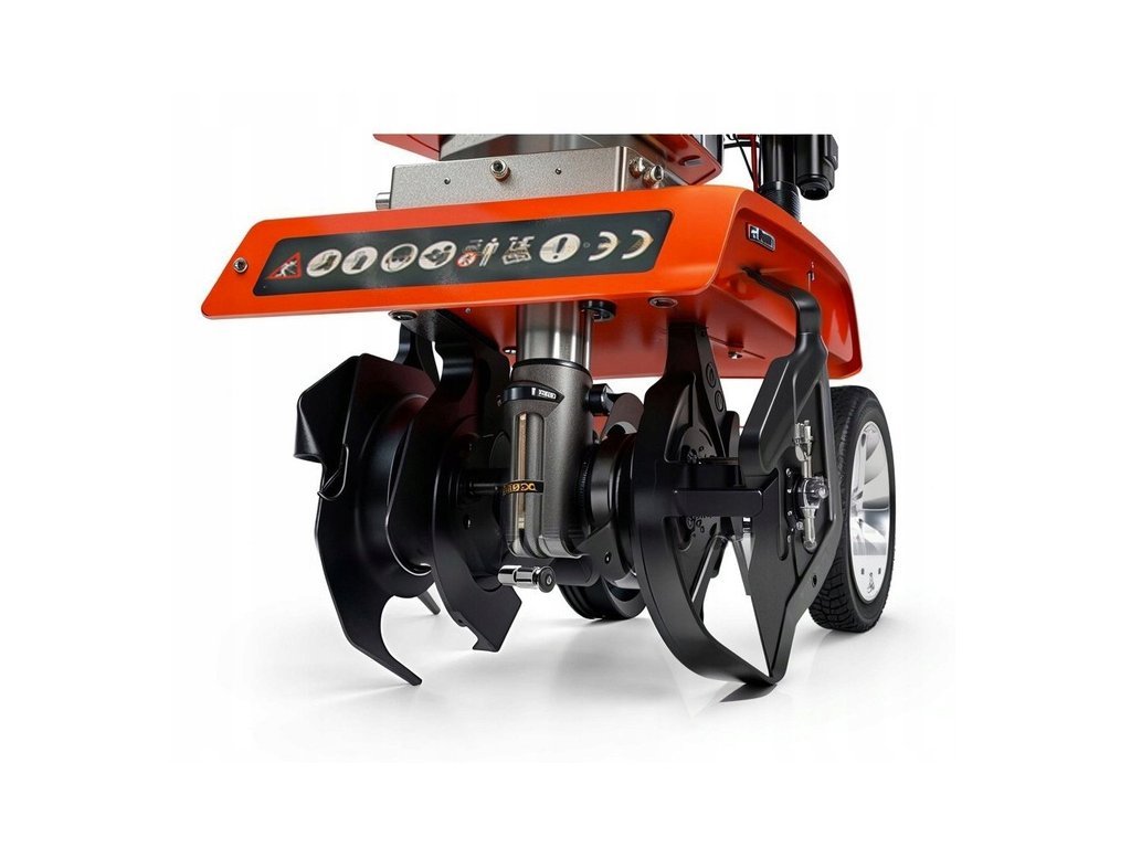 Stroj je postavený na pevnom ráme, ktorý zaručuje dlhú životnosť. Celková hmotnosť 17 kg je optimálne vyvážená pre dobrú stabilitu a zároveň ľahkú ovládateľnosť. Pre jednoduchý presun po záhrade je kultivátor vybavený dvomi praktickými kolesami, ktoré zároveň slúžia na nastavenie a udržiavanie pracovnej hĺbky. Ergonomicky tvarované rukoväte s protišmykovou úpravou zaisťujú pohodlný a bezpečný úchop. Po práci je možné rukoväte jednoducho sklopiť, čo výrazne uľahčuje skladovanie a prepravu stroja. Ovládacie prvky, vrátane bezpečnostného vypínača a plynovej páky, sú intuitívne umiestnené priamo na rukoväti pre maximálny komfort a kontrolu.