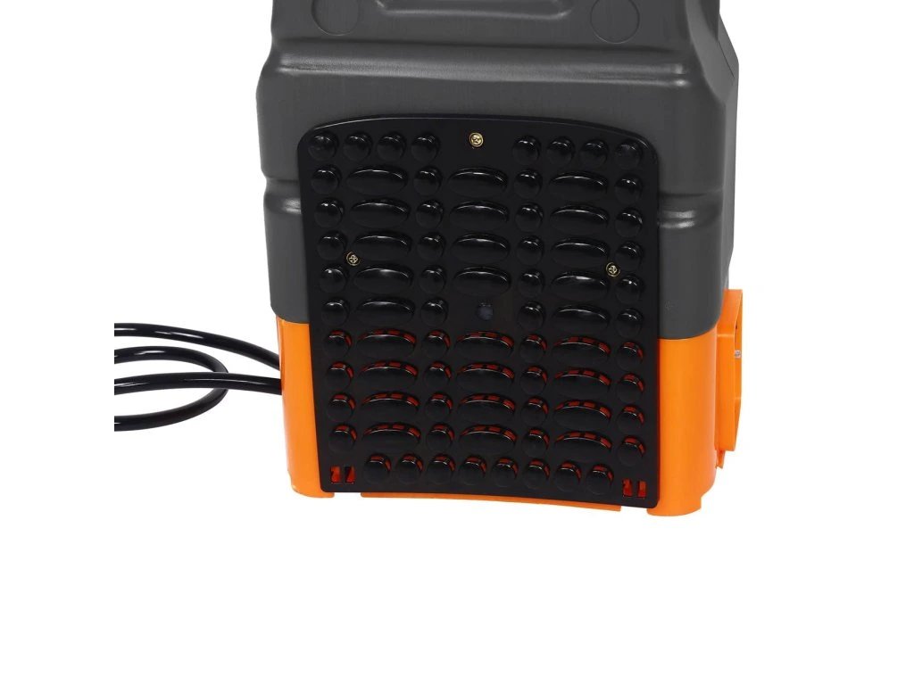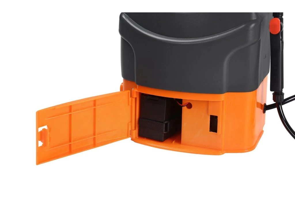 Chrbtová konštrukcia s pohodlnými, nastaviteľnými popruhmi rovnomerne rozkladá hmotnosť naplneného postrekovača, čím šetrí váš chrbát. Samotná nádrž je vyrobená z kvalitných materiálov (poly-etylén) odolných voči chemikáliám. Pevné spony na popruhoch zaručujú bezpečnosť a odolnosť. Prístup k batérii je jednoduchý vďaka kontrolnému krytu, čo uľahčuje jej prípadnú výmenu.