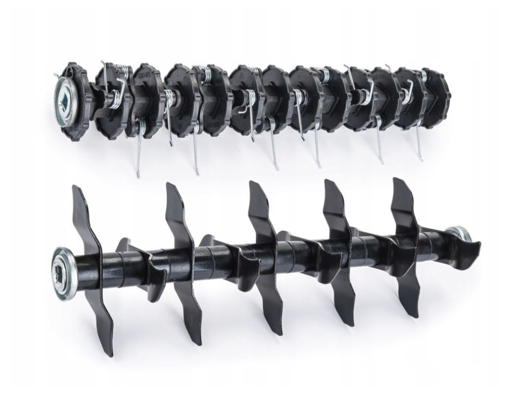 - Prevzdušňovací valec (s pružinami): Tento valec je vybavený 24 oceľovými pružinami (pazúrikmi). Slúži na jemnejšie, povrchové vyčesávanie machu, lístia a odumretej trávy. Je ideálny na pravidelnú údržbu počas sezóny, pretože je k trávniku šetrnejší.