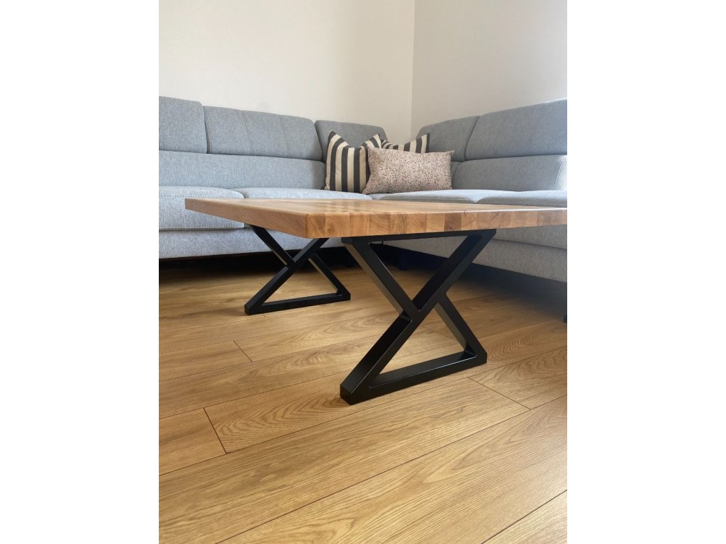 - Masívne kovové nohy v tvare X: Čierne, práškovo lakované nohy z oceľového profilu tvoria dominantný a vizuálne silný prvok. Ich prekrížený tvar X nielenže zaisťuje dokonalú stabilitu a nosnosť, ale zároveň dodáva stolíku nezameniteľný industriálny a loftový charakter. Matný povrch laku je elegantný a odolný.