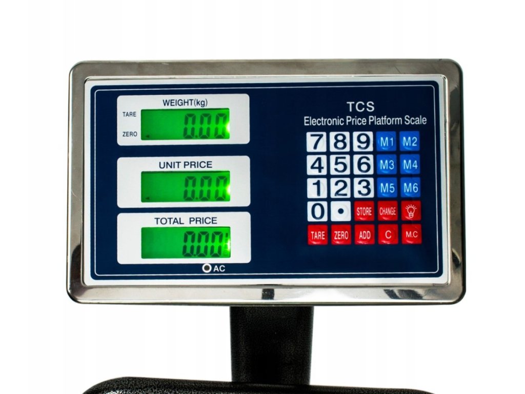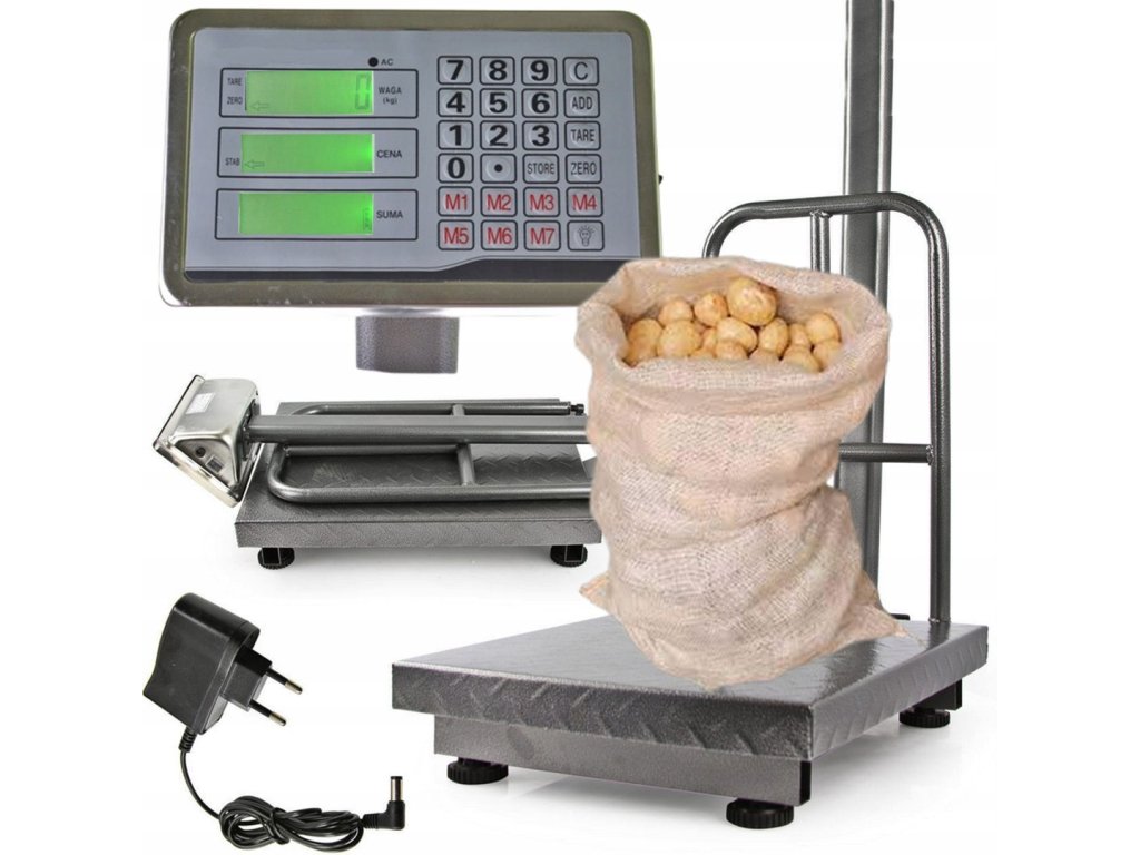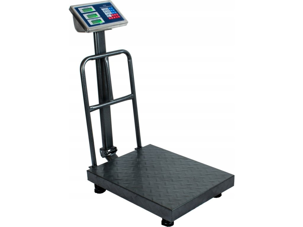 Technické parametre: nosnosť 300 kg, dielik 50 g, plošina 45×60 cm (nerez), podsvietený LCD indikátor, funkcie TARE/ZERO/HOLD/ADD/Σ, libela a výškovo nastaviteľné nožičky, oceľový rám/stĺpik, pracovná teplota 0–40 °C, napájanie 230 V AC + batéria (až 30 h).