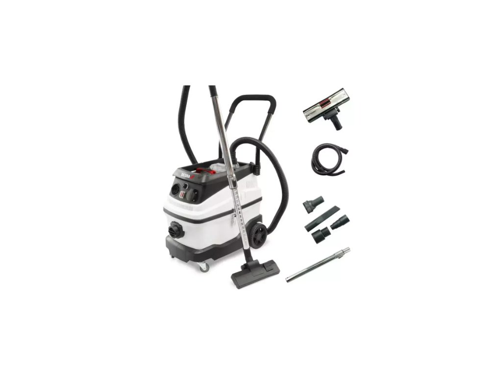 Vysávač je dodávaný s flexibilnou sacou hadicou, teleskopickou kovovou trubicou, podlahovou hubicou s prepínaním na tvrdé a kobercové povrchy, štrbinovou hubicou a dvoma filtrami (HEPA a špongiový). 30-litrová nádrž z nerezovej ocele je odolná voči korózii a mechanickému poškodeniu. Podvozok s otočnými kolieskami zaisťuje ľahkú mobilitu a stabilitu stroja aj pri plnej nádrži.