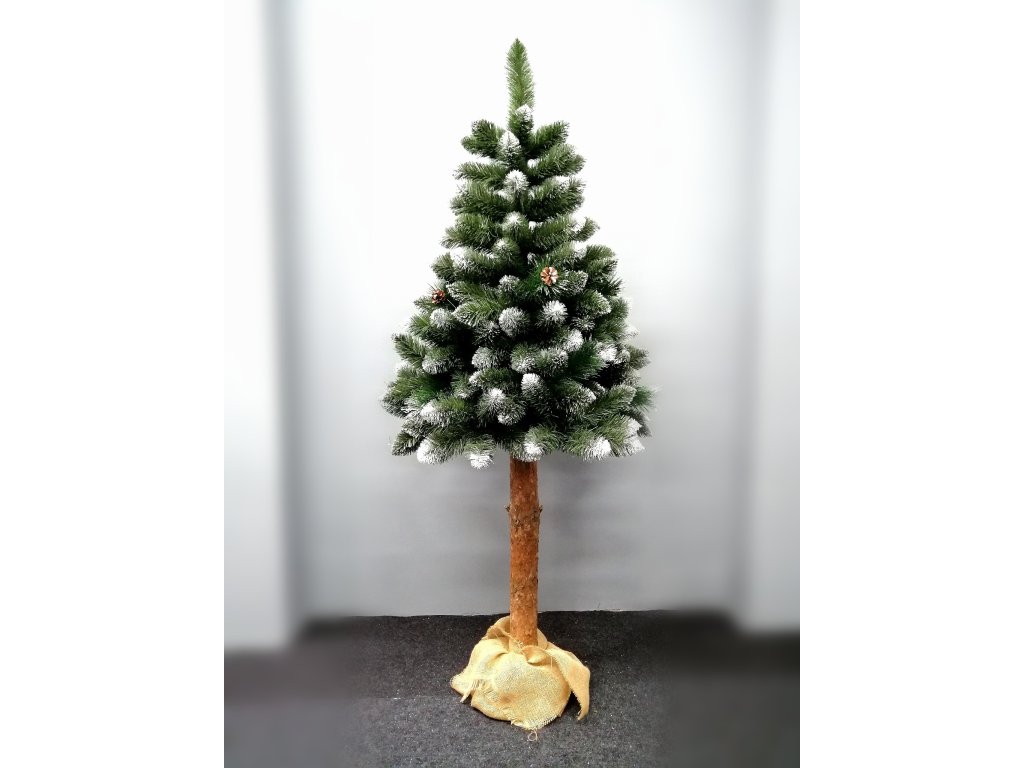 Zelená časť vianočného stromčeka je zasadená na prírodný drevený kmeň pripevnený k stabilnému, drevenému stojanu (tanieri) zabalenému do prírodnej jutovej šatky.