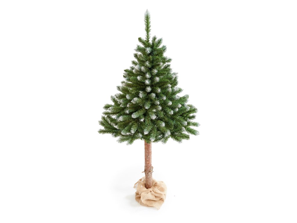Vianočný stromček je postavený na prírodnom drevenom kmeni pripevnenom k stabilnému drevenému stojanu (doske) zabalenému do prírodnej jutovej šatky.