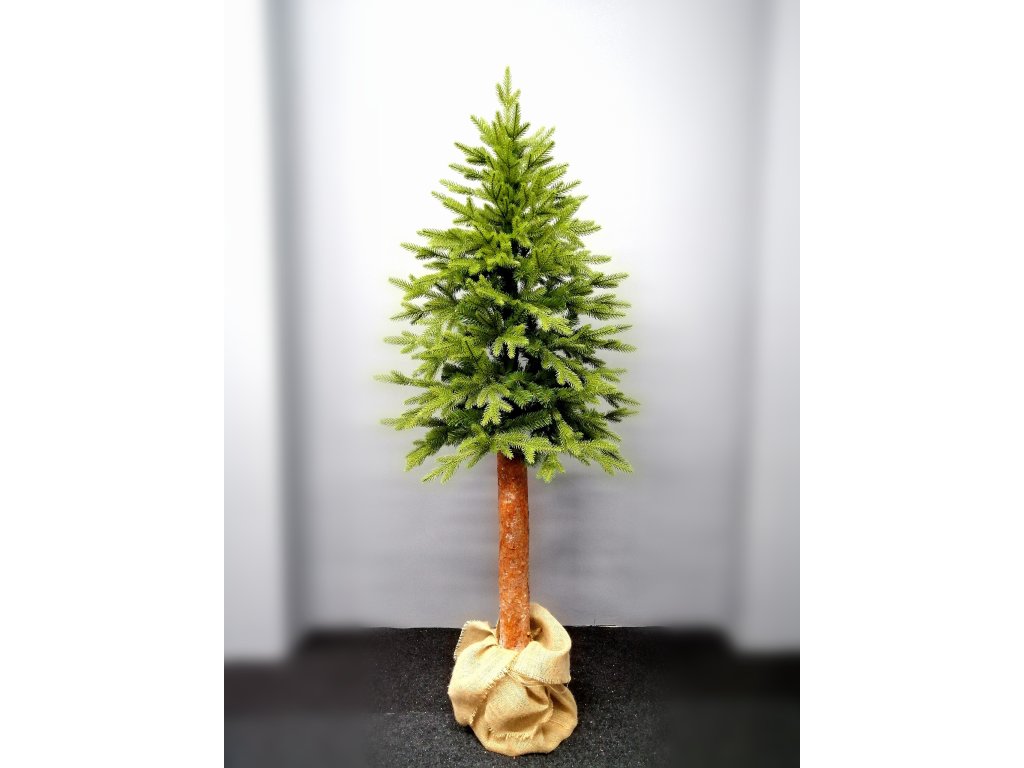 Zelená časť vianočného stromčeka je zasadená na prírodný drevený kmeň pripevnený k stabilnému, drevenému stojanu (tanieri) zabalenému do prírodnej jutovej šatky.